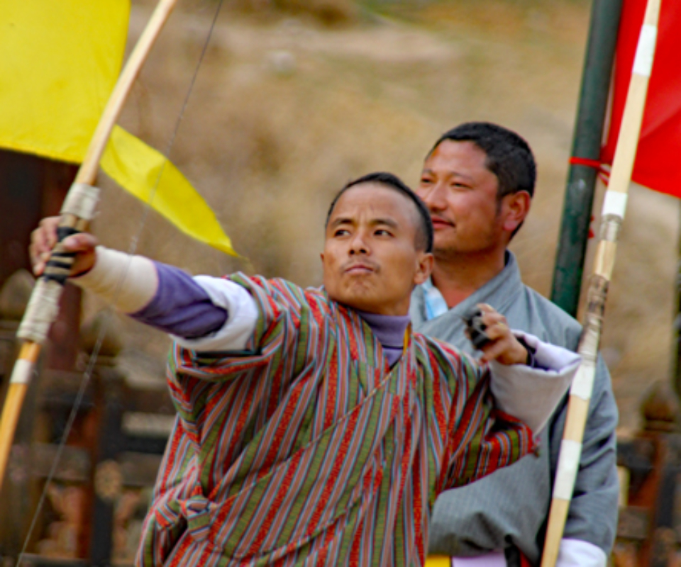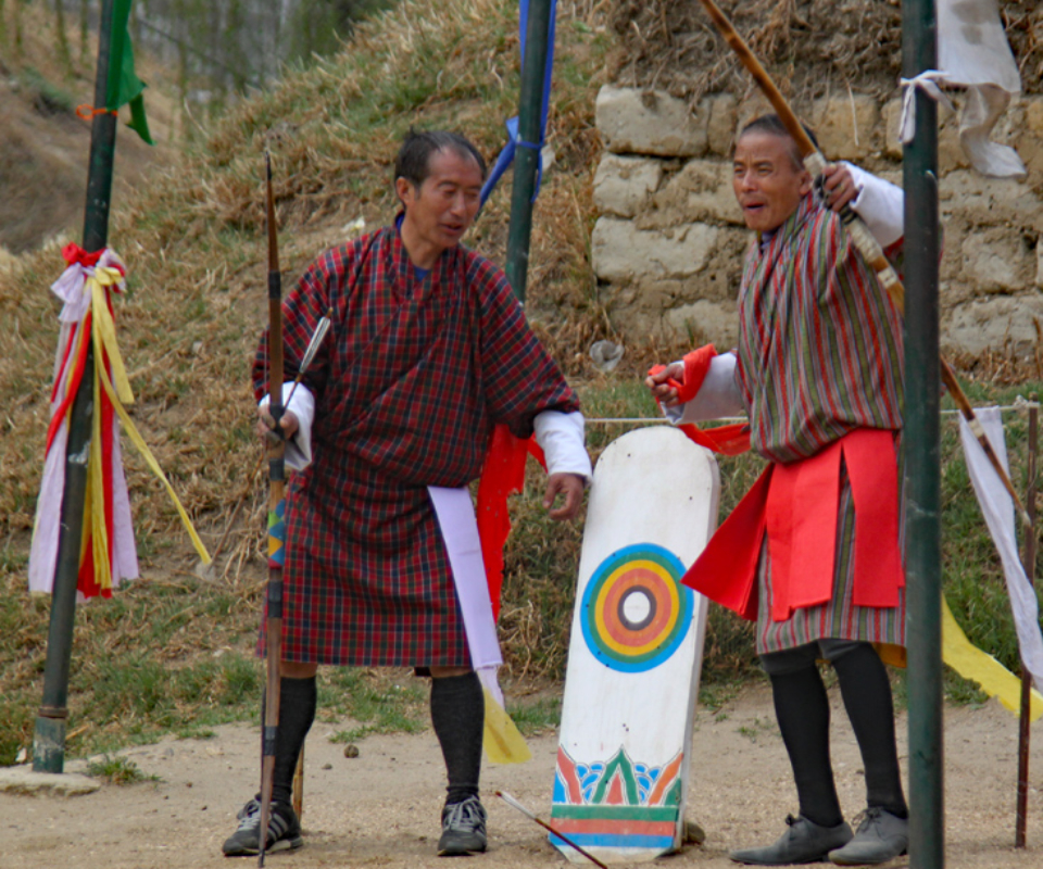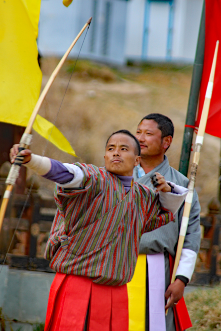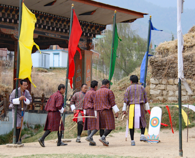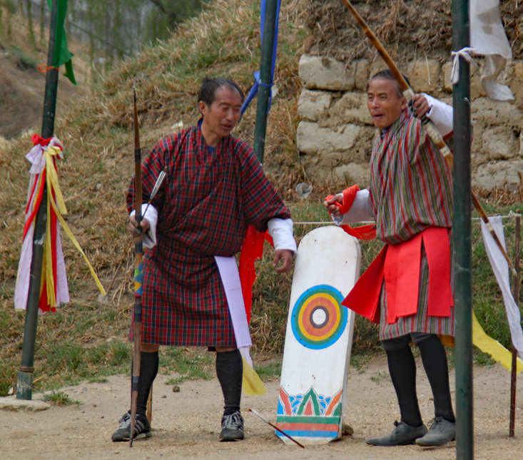 One of the most interesting stops of the day was to watch an archery match. Archery is the national sport of Bhutan, and their rules are unique to the country. Two teams of archers take turns shooting two arrows each at a small 3×1 foot wooden target, 476 feet (145 meters) across the field. Teams have archers at both ends of the field and they shot arrows first one direction, then the other. Players taunt one another from the other end, and every time an arrow hits the target (which isn’t often) they perform a celebration dance. A match can go on for days. It was absolutely fascinating to watch.
