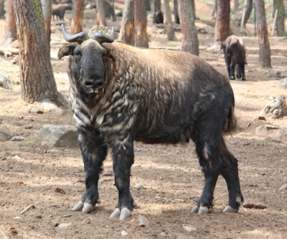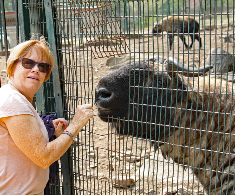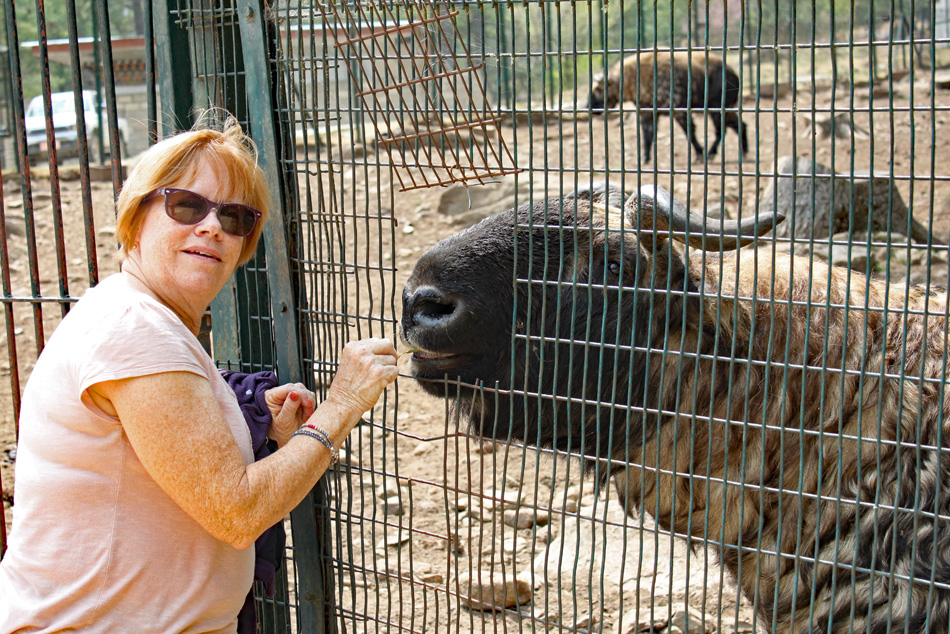 On our way back down, we stopped at a takin preserve. The takin is the national animal of Bhutan, and seems to be a cross between a goat, antelope and a buffalo, (see pictures below). The animal roams the Himalayas in Bhutan and western China. The takin roamed with a large area surrounded by a high fence. We were lucky because several of the takin were fairly close where we could get a good look at this strange animal. Belinda was able to coax one over to eat some grass out of her hand through a hole in the fence.