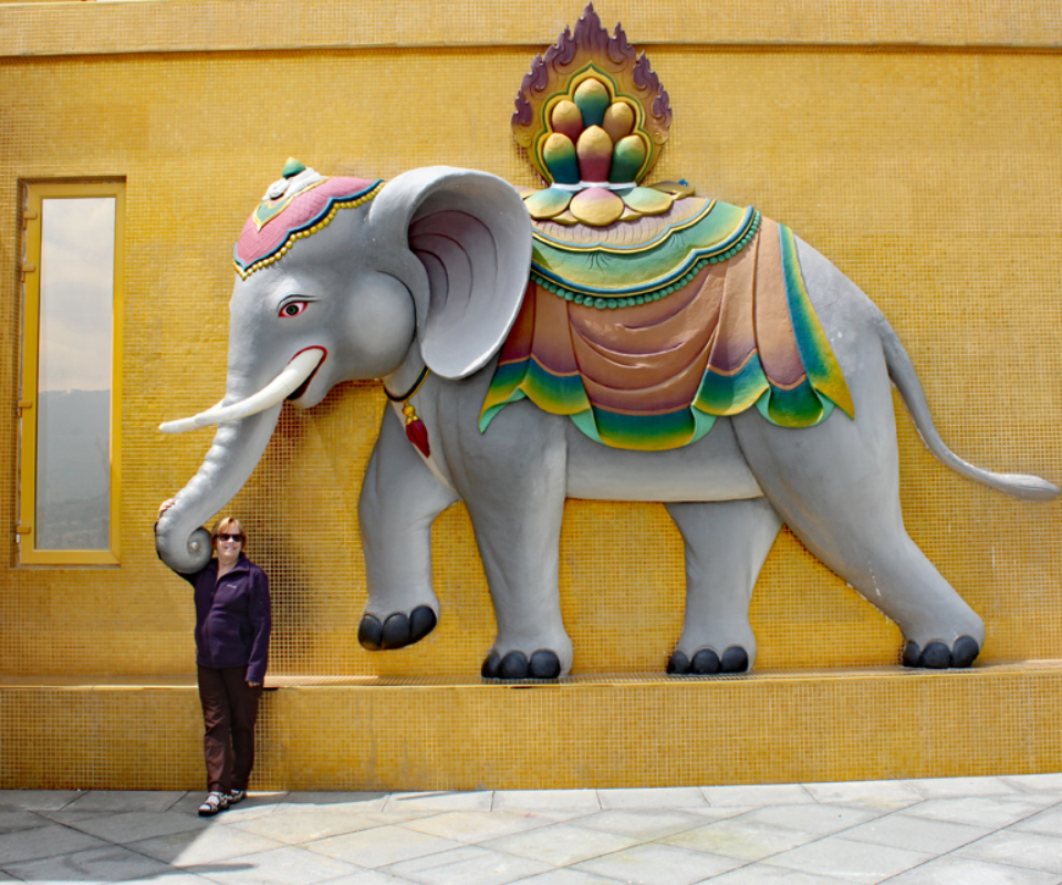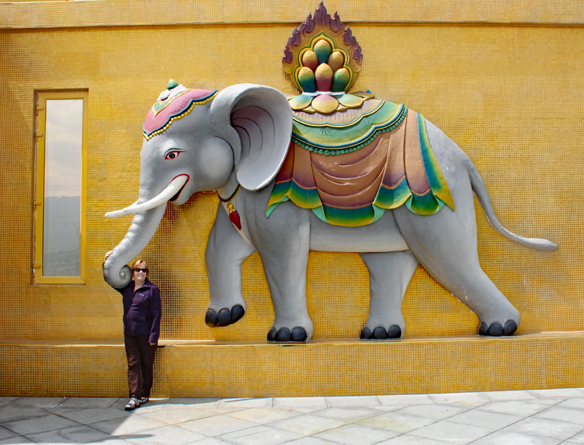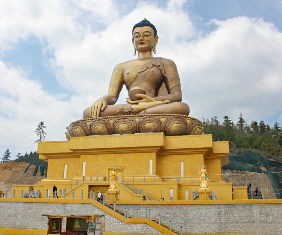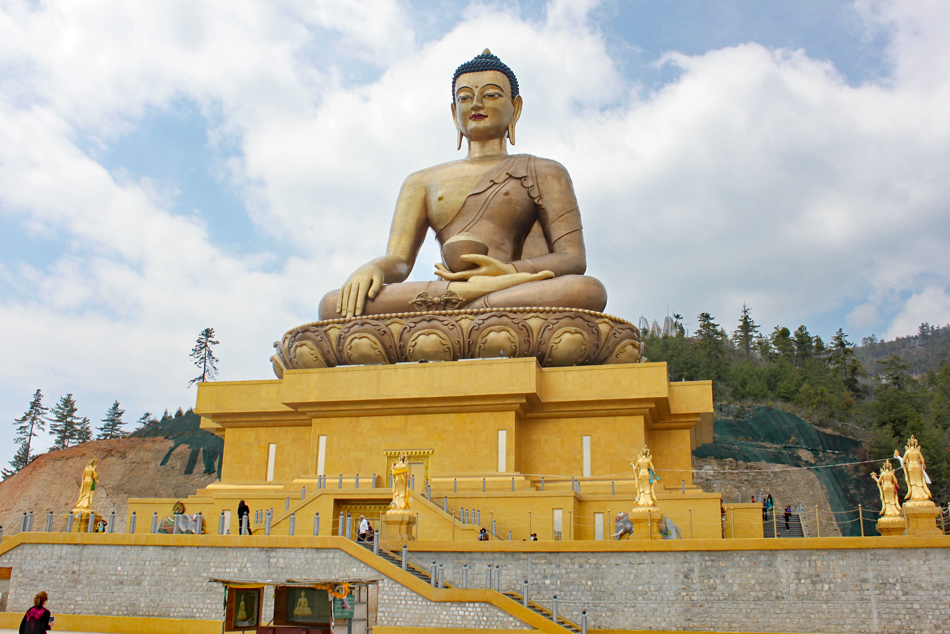 Next we drove above the city for scenic views of the valley and the city of Thimphu. Here we could see the Tashichho Dzong, the seat of the Bhutanese government and the king’s palace, which is quite small as the king requested the money be spent on infrastructure (e.g. roads, hospitals and schools). We then drove high above the city where they have erected a massive (169 feet / 51.5 meter) statue of Buddha with a temple inside the base. The surrounding courtyard is still under construction, but the statue offered stunning views of the surrounding area. While the surrounding courtyards are still under construction, the main statue was complete. The viewpoint offered stunning views around the area.